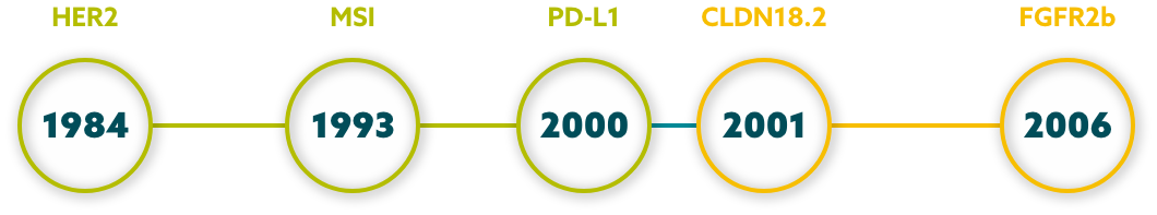 CLDN18.2=Claudin 18.2; FGFR2b=fibroblast growth factor receptor 2b; HER2=human epidermal growth factor receptor 2; MSI=microsatellite instability; PD-L1=programmed death-ligand 1.